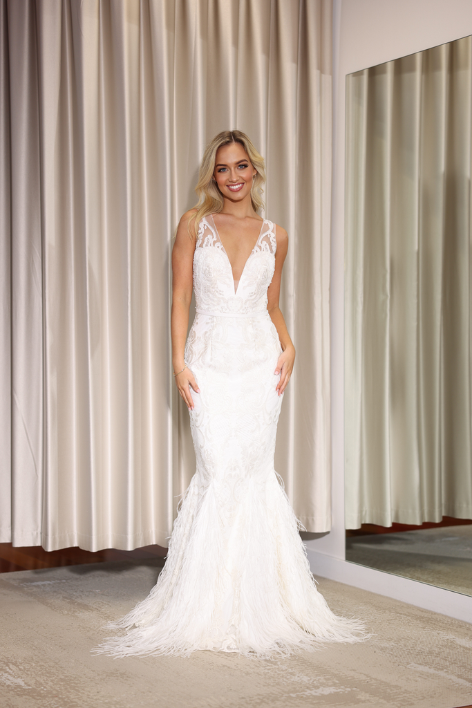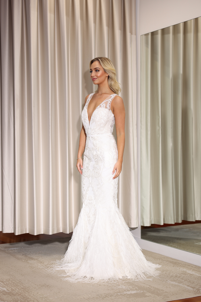 A gorgeous two piece set by Australian Designer Jadore, Style JX1011. . A deep V-neck style featuring beautiful lace design and feather detailing on the skirt.