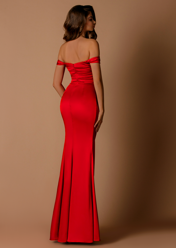 Behold the stunning dress designed by Nicoletta from Australia - Style NBM1029. With its off the shoulder, sweetheart neckline and ruched waistline, the Kenzie Gown highlights and flatters the waist. The ruched detailing continues onto the skirt, complete with a daring high side split.