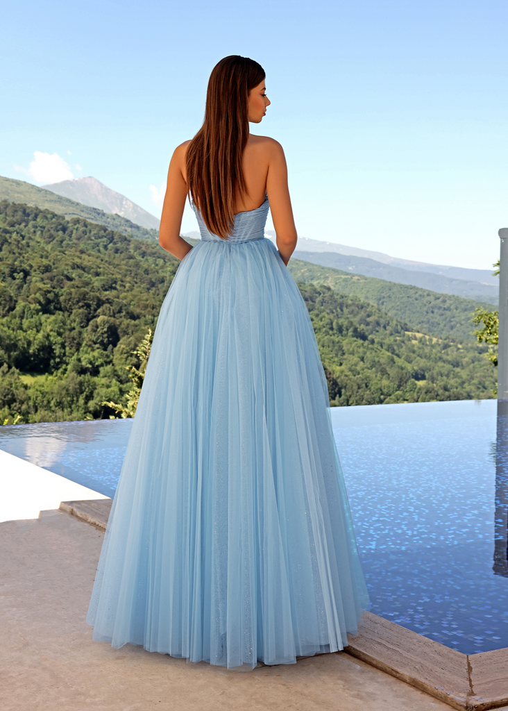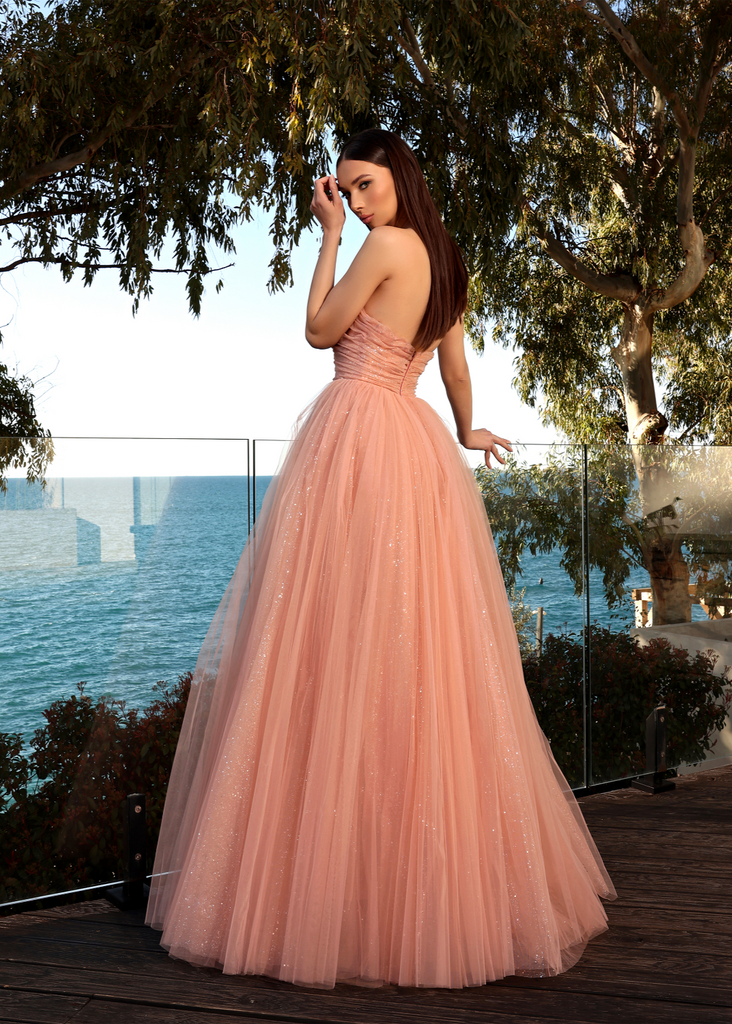 Experience the awe-inspiring beauty of the Nicoletta's Australian Designer Kiera Gown NC2020! This stunning dress features a strapless bodice, ruched organza with a corset-style bodice, and dazzling glitter that glistens and sparkles against a padded bust. The full-length A-line skirt exudes elegance with a breathtaking glitter detail throughout the fabric.