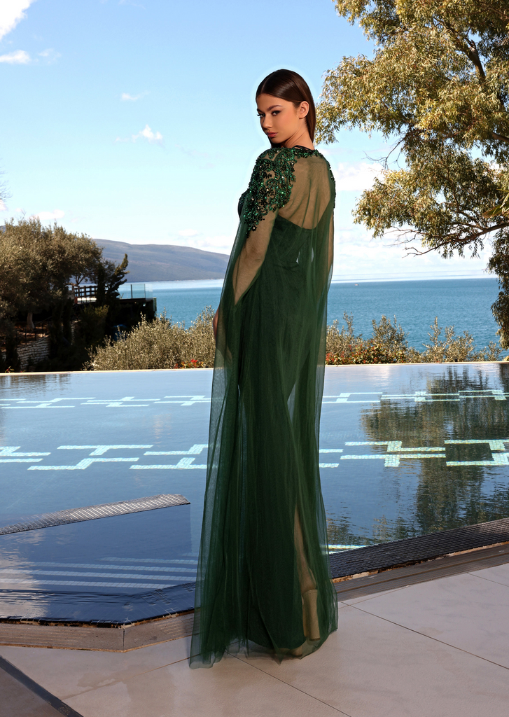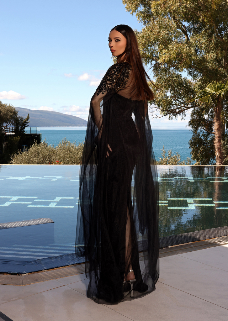 Transform into a glamorous goddess with the NC2019 Layal Gown from Nicoletta! This stunning dress from "down under" boasts a strapless sweetheart neckline, intricately beaded embellishments on the bust, a timeless pencil silhouette, and a fitted waist for a coveted hourglass figure. And the cherry on top? The detachable sheer cape adorned with delicate beaded accents along the neck and shoulders, adding a touch of sophistication. With or without the cape, this gown is a must-have for any fashion-forward individual looking to make a statement. Don't wait, get your hands on this fabulous gown now!