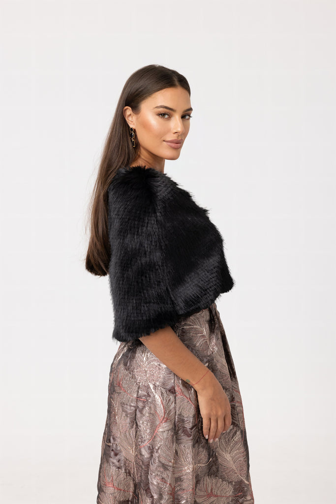Elevate your evening look with the oh-so-cute Leea Cape from Romance The Label, an Australian designer. This cozy faux fur cape is a must-have for chilly nights out, complete with a button closure and cropped fit.