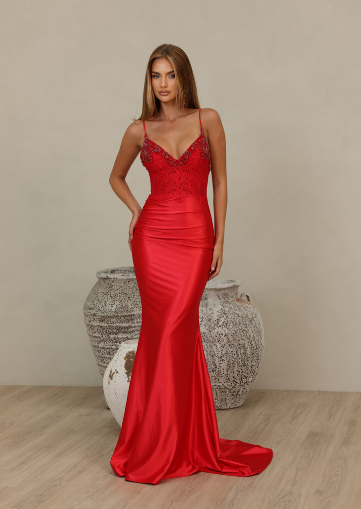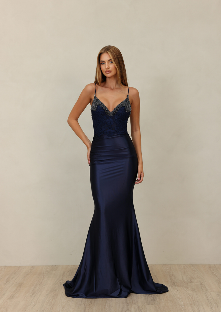 Boasting an exceptional full-length design, the NC1018 by renowned Australian designer Nicoletta delivers a breathtaking piece of evening wear. The Gigi Gown features a v-neckline, with a lace bodice offering exquisite beaded embellishments on the front and back. With a form-fitting satin skirt ruched at the hips and a back train, this mermaid-style gown is fit for any special occasion.