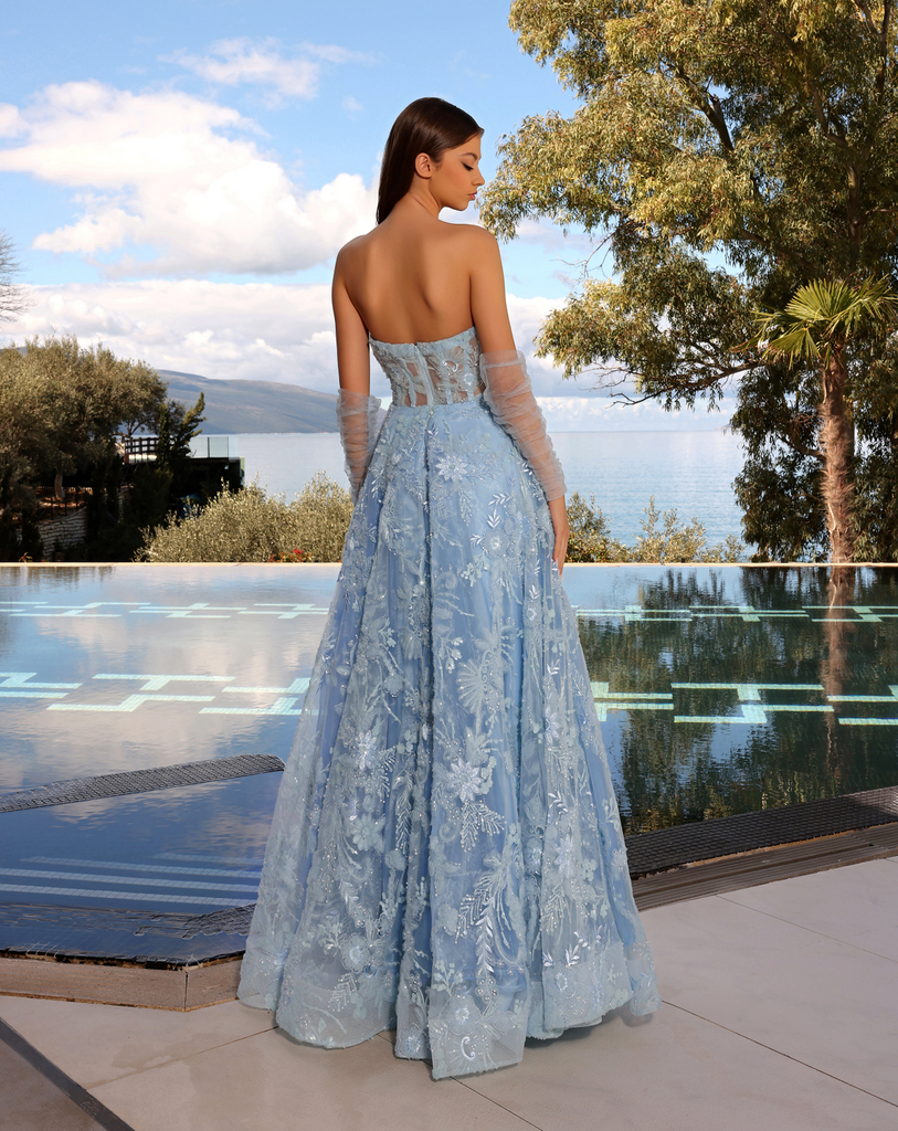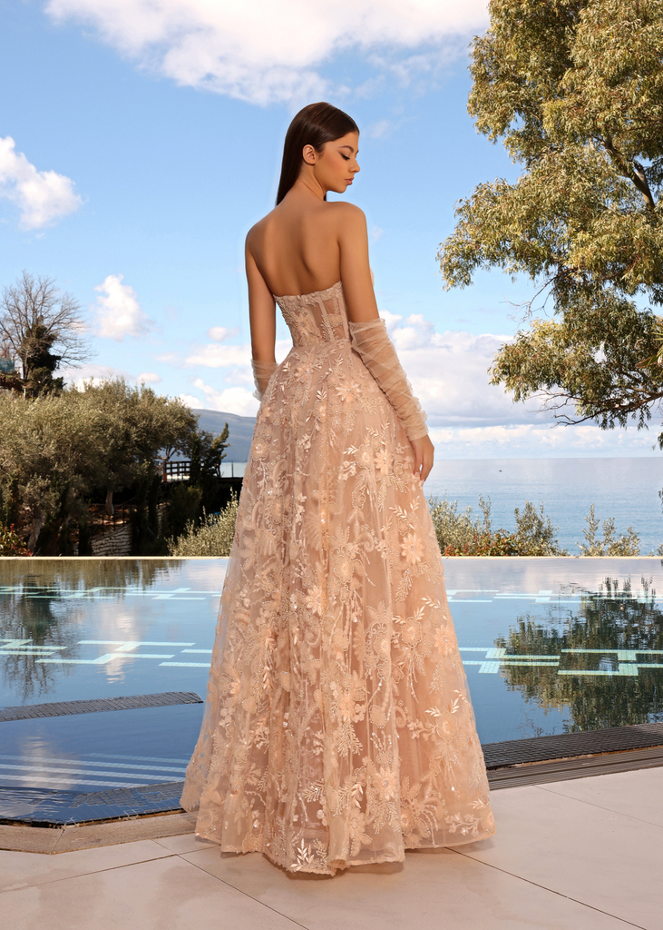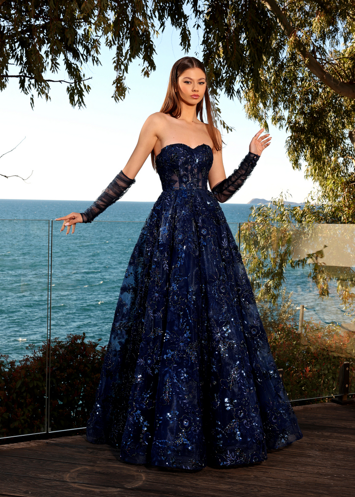 An exquisite and elegant creation from Australia, the Onyx Gown, also known as Nicoletta's NC2039, features a timeless A-line silhouette, enhanced by a strapless sweetheart neckline sheer bodice and intricate floral applique designs. For a stunning and flattering fit, the waist is cinched, and the detachable sheer sleeves add a touch of sophistication.
