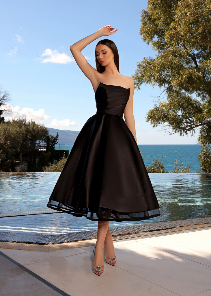 Experience the beauty and style of Australian-made fashion with Nicoletta's NC2040 Nebula Midi. This stunning midi length design boasts a flattering strapless boat neckline and a cinched waist, creating an iconic A-line shape. The sheer trim adds a touch of elegance, making it the perfect addition to your wardrobe.