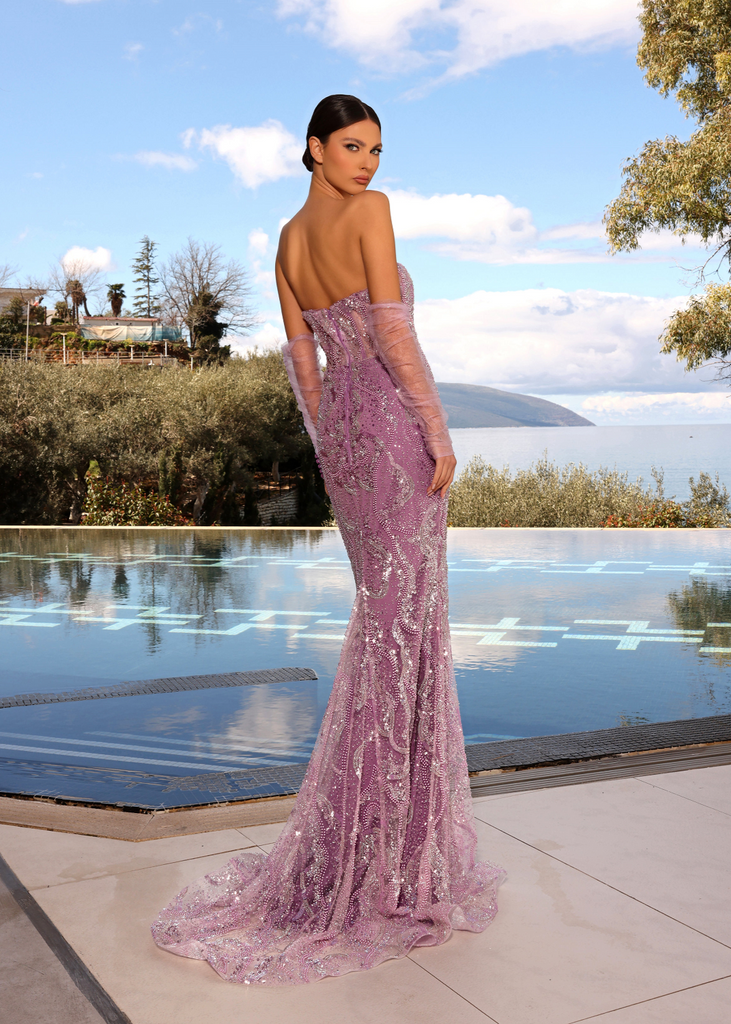 Indulge in pure luxury with Sherah Gown NC2041 by Australian Designer Nicoletta. This exquisite piece boasts a strapless sweetheart bodice, padded bust, and fitted silhouette that flows into a breathtaking mermaid skirt. Adorned with a decadent beaded design, this dress also includes detachable sheer sleeves for a touch of sophistication.