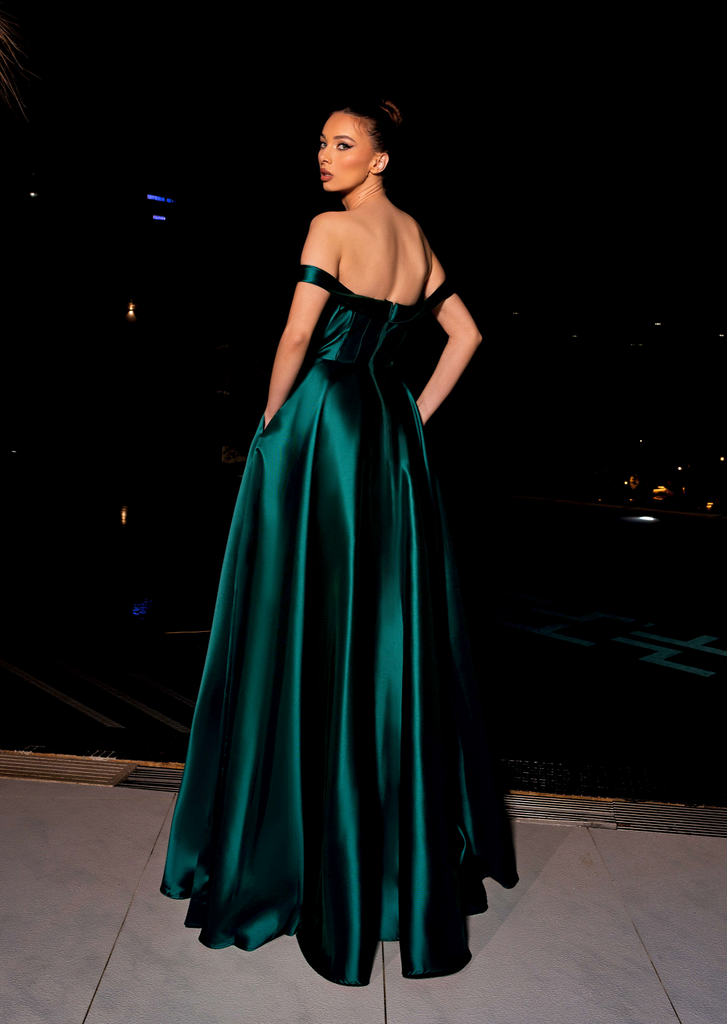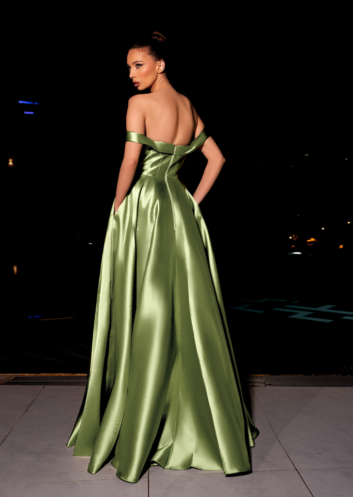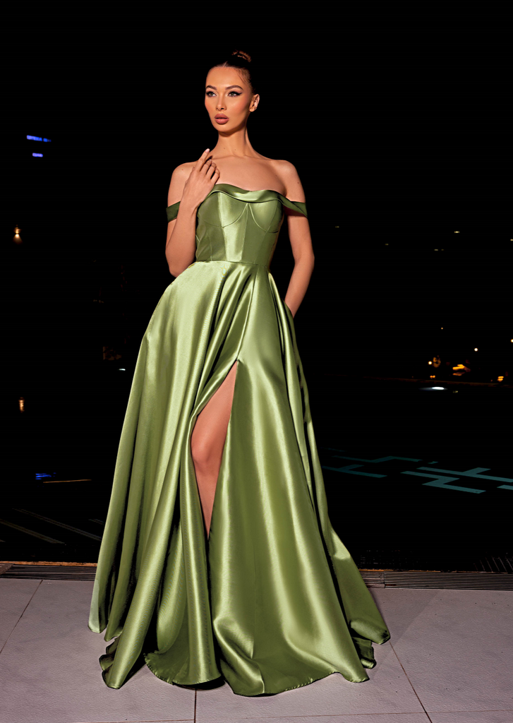 Become the ultimate fashionista with the Nicoletta NC2051 dress. The Mavius Gown features an off-the-shoulder neckline and a cinched waist for a flattering silhouette, leading to a stunning A-Line skirt complete with pockets and a slit for a show stopping appearance.