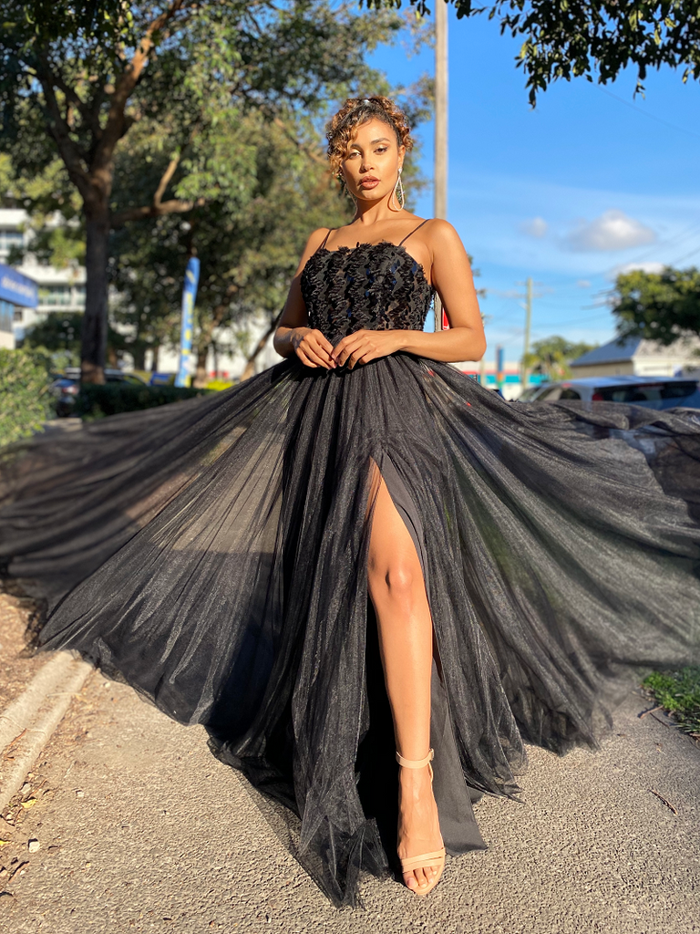 A beautiful full length gown by Australian Designer Jadore, Style JX4057. The Noor gown features a straight neckline with spaghetti straps and a bodice detailing full of textured, oval shaped sequins. This A-Line Style is finished with a tulle skirt, complete with a high side split.