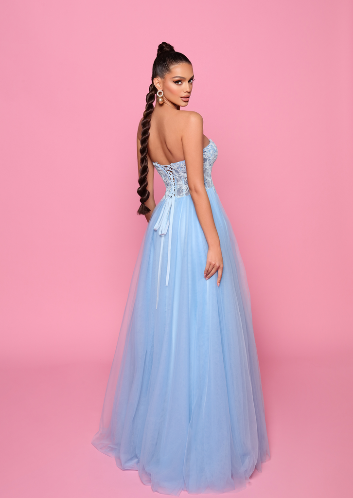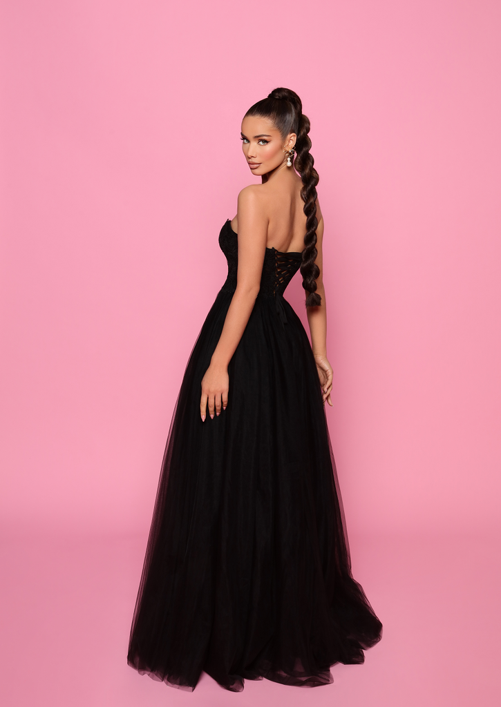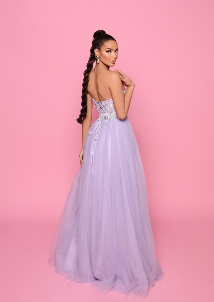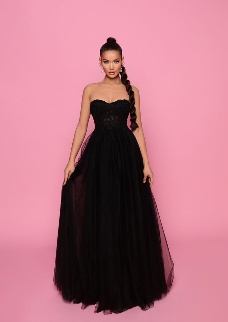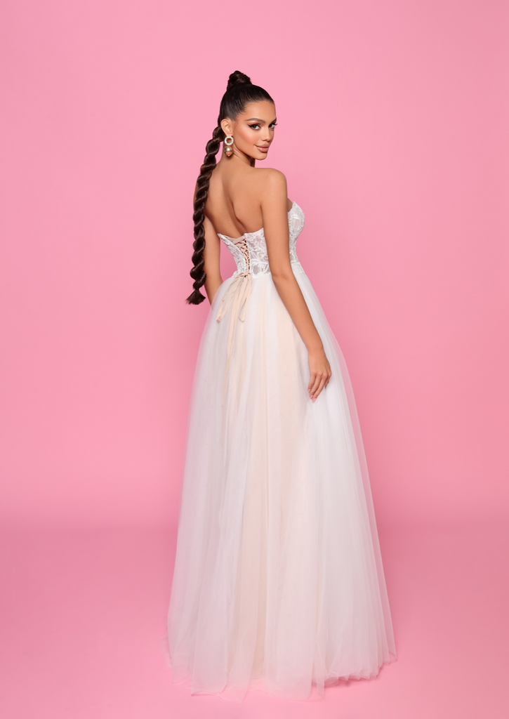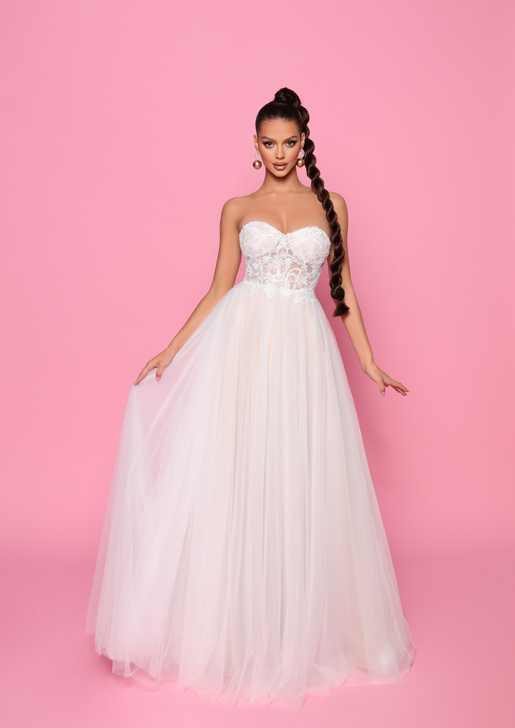 Jadore's NP147, the Grande Gown, is a breathtaking full-length creation boasting a strapless, sweetheart neckline and sheath bodice with lavish embellishment ending at its waistline. Meticulously fitted at the waistline, this dress then cascades into an eye-catching tulle skirt, resulting in an exquisite ball gown silhouette.