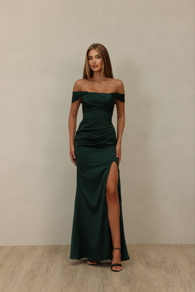 Get ready to turn heads in this stunning gown by renowned Australian Designer Tania Olsen. Style TO2425 boasts a flirty off-the-shoulder neckline and a cinched waistline with stylish ruched detailing. The playful ruching continues down to the skirt, which is topped off with a fun side split.