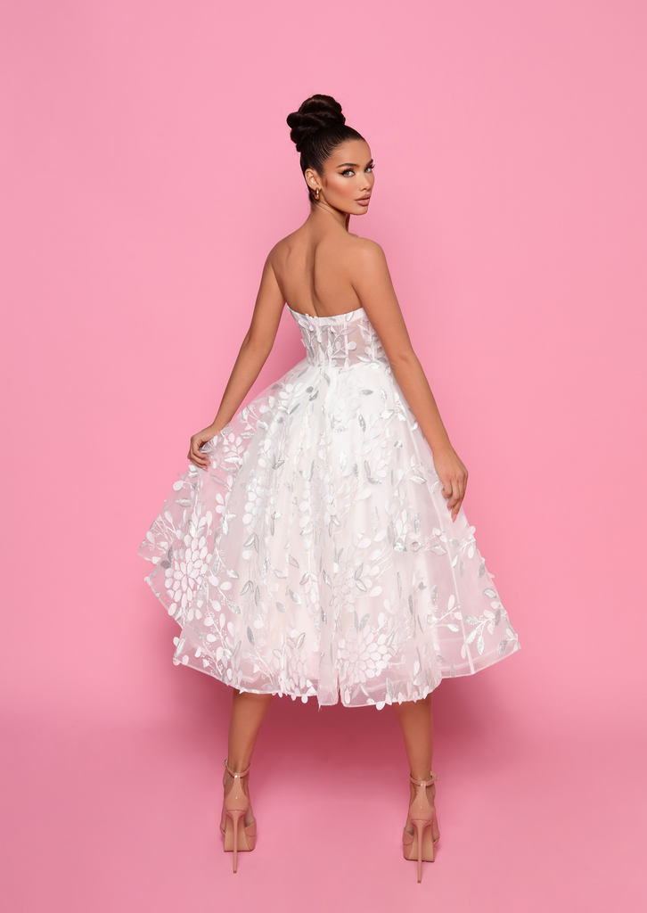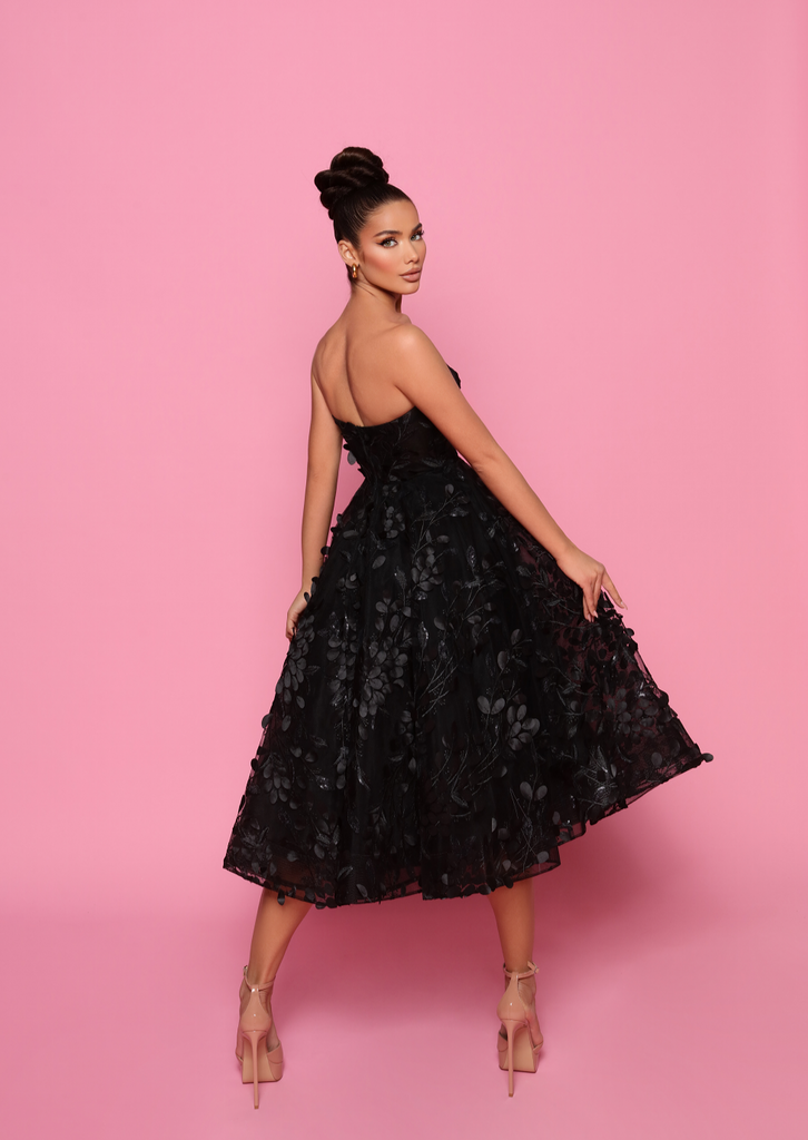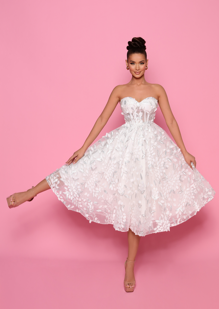 A beautiful midi length dress by Australian Designer Nicoletta, Style NP145. A lovely floral detailing covers the length of the Royal Midi, which also features a strapless, sweetheart neckline. The Royal Midi is cinched at the waistline before flaring out to create the classic A-line silhouette. The Royal Midi is designed with premium fabrics to ensure that you stay comfortable and look great all day. It's made with the highest quality craftsmanship and attention to detail.