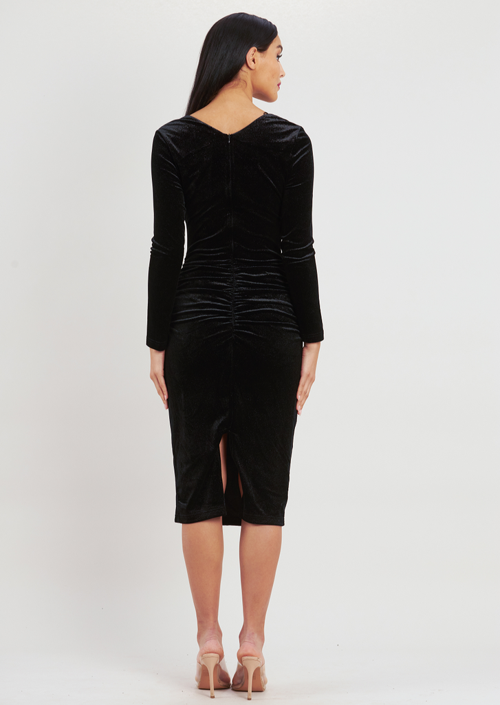 A gorgeous midi length dress by Australian Designer, Romance the Label.This form fitting midi with a beautiful Velvet detailing that covers the length of the dress. This dress also features a V-neckline, and is complete with long sleeves and a gorgeous tie up on the waist. The Sade Dress is finished with a back split.