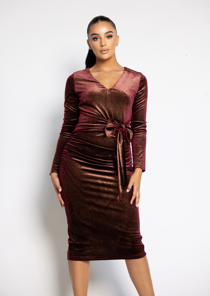 A gorgeous midi length dress by Australian Designer, Romance the Label.This form fitting midi with a beautiful Velvet detailing that covers the length of the dress. This dress also features a V-neckline, and is complete with long sleeves and a gorgeous tie up on the waist. The Sade Dress is finished with a back split.