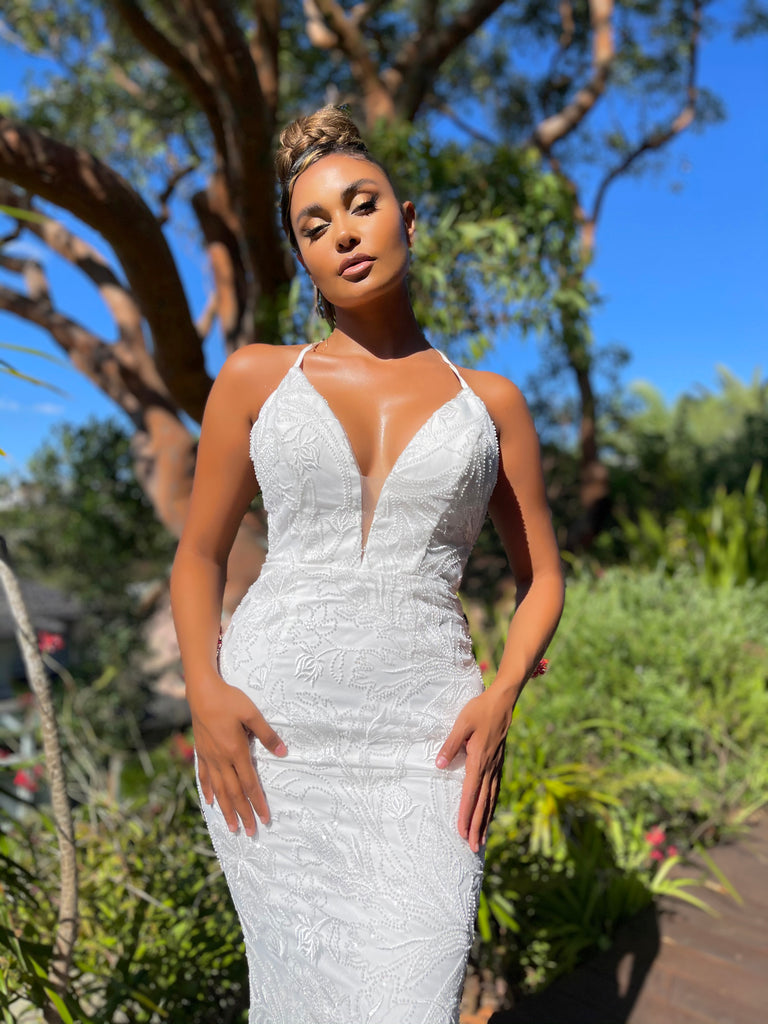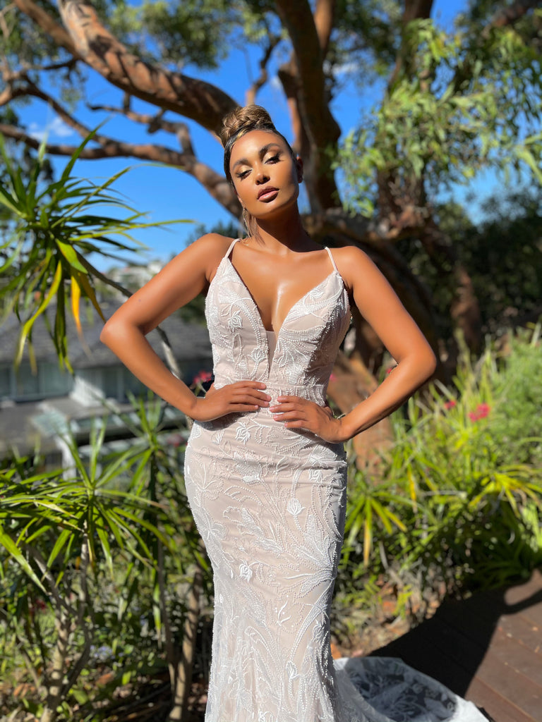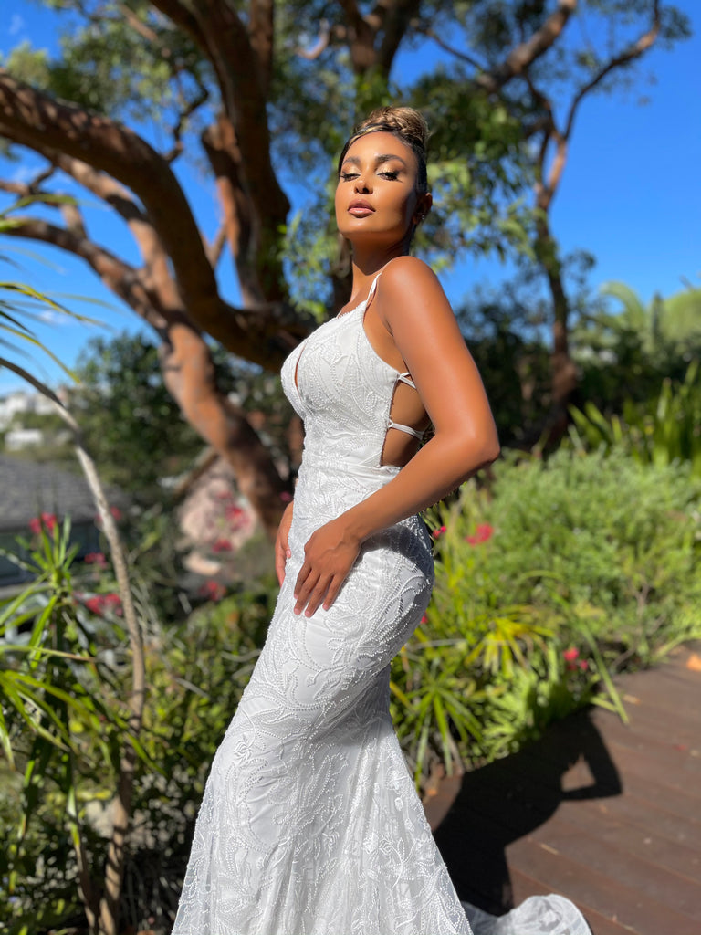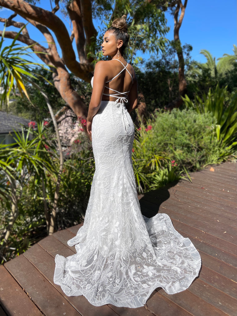 The Shooting Star Gown, style JX5053 by Australian Designer Jadore, features a sheer Ivory lace layered over your choice of an Ivory or Nude lining, detailed with an open back, and a floaty feel to the structured mermaid silhouette.