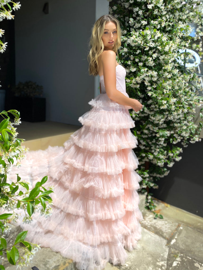 Our gorgouse Starry Night Gown style JX5039 by Australian Designer Jadore. The perfect ball gown for your next school formal, deb ball or evening function. This exciting A-line gown features a crystal sequined bodice perched on top of cascading tiers of organza ruffles.