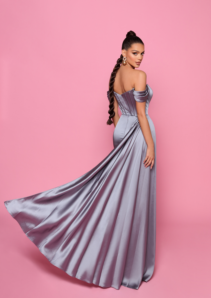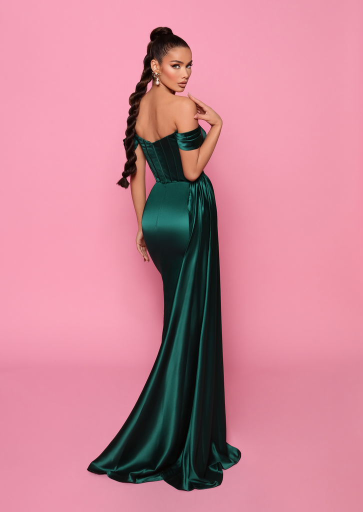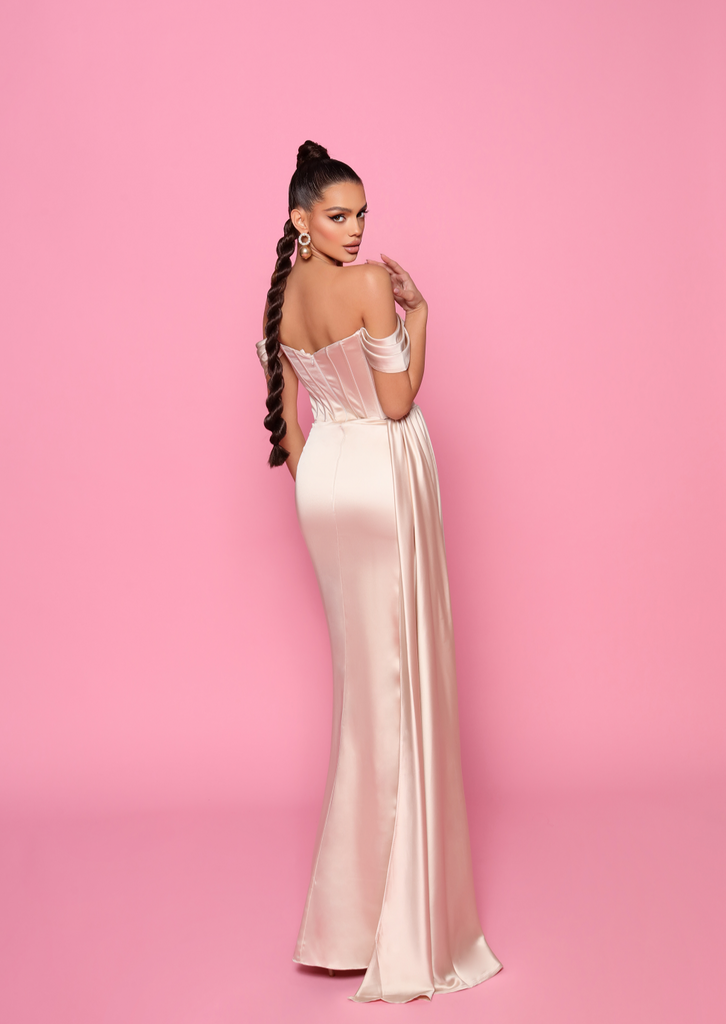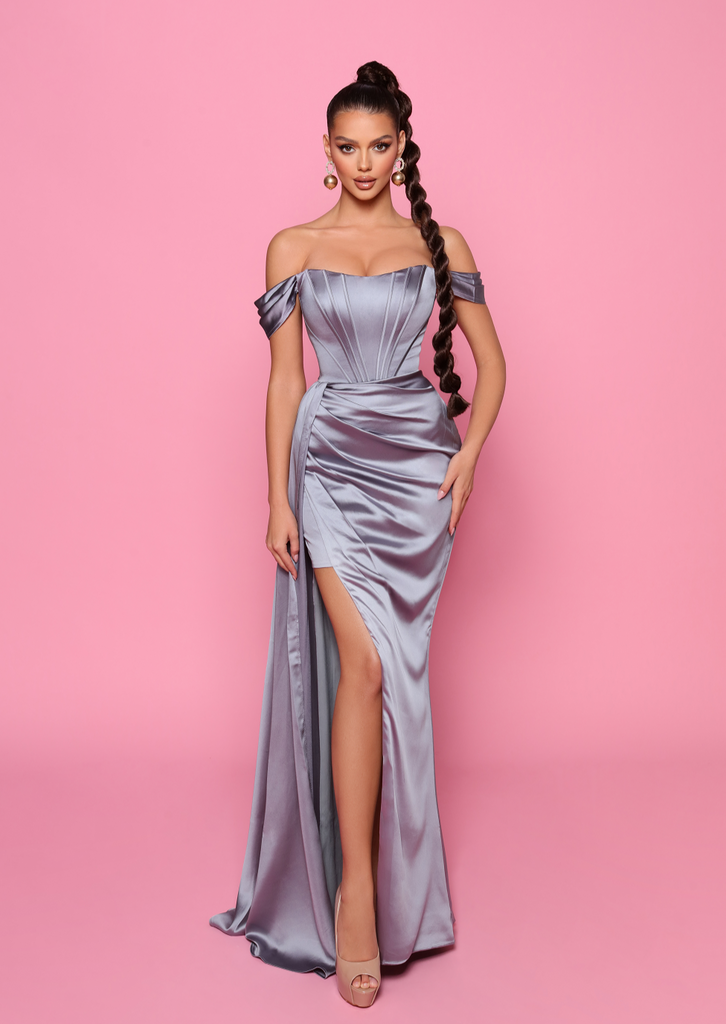 A stunning full length gown by Australian Designer Nicoletta, Style NP185. The Bond Gown features an off the shoulder corset design bodice design, and is cinched at the waistline before the pencil skirt ruffles finishing with a overlay piece to the side.