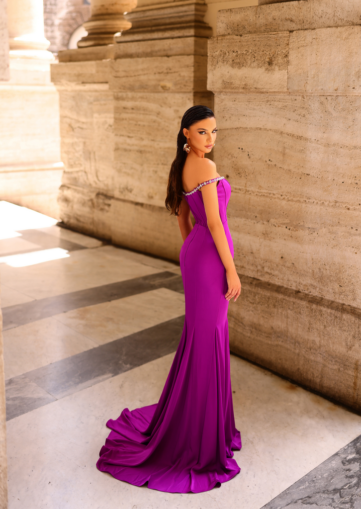 Check out Nicoletta's stunning NC1086 Valentina Gown, a full-length showstopper! This gorgeous ensemble boasts an off-the-shoulder corset bodice, adorned with dazzling diamante jewels. This stunning silhouette is made all the more alluring with its form-fitting design and delicate back train.
