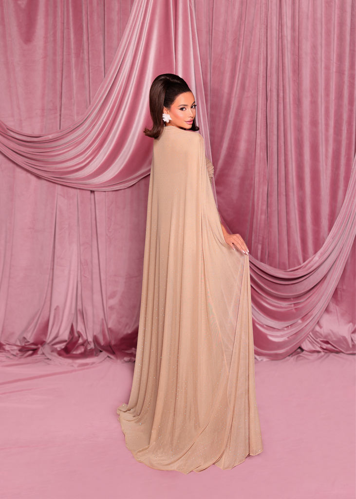 The Agnus Gown by Nicoletta features a strapless sweetheart neckline, a flattering pencil silhouette, and a fitted waist for an elegant hourglass shape. Its beautiful split and detachable sheer cape add sophistication, making it perfect for making a stylish statement.