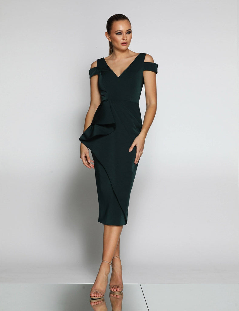 A lovely midi length dress by Australian Designer Jadore, Style JX1063. The Kate Midi features a gorgeous gathered detailing that starts on the waist and continues through to the skirt. The Kate Midi also features a v-neckline and Off shoulder detail.