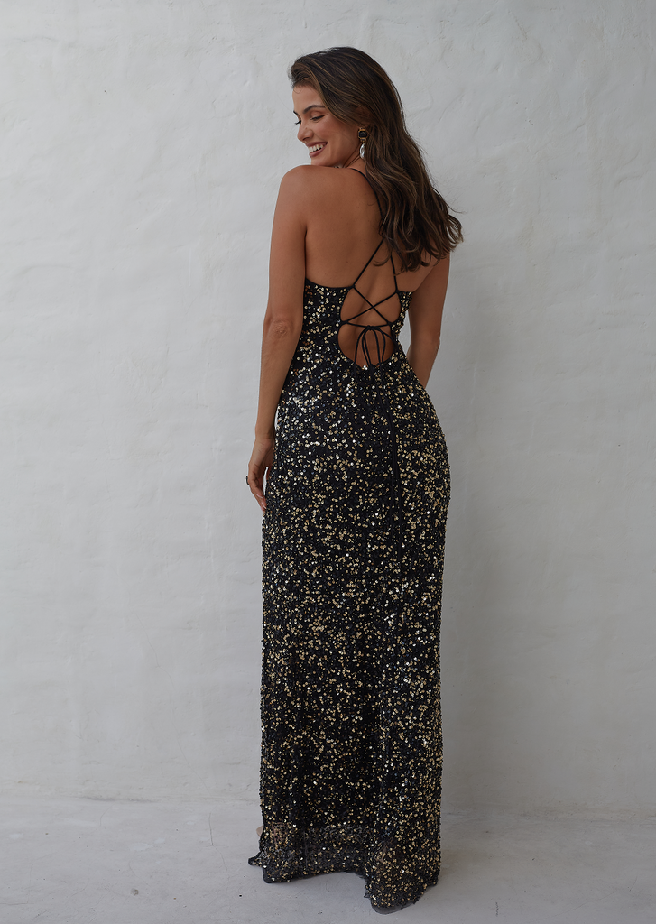 Unleash your inner fashionista with the one-of-a-kind Rainey Gown by Australian Designer Nicoletta, Style PO2451. Showcasing a flirty deep v-neckline and a unique criss cross back, this form fitting gown will have all eyes on you. The high side split adds an extra touch of drama, while the stunning sequin detailing adds a playful touch to the overall look. Get ready to shine and stand out in this gorgeous masterpiece.