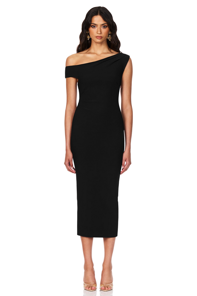 Indulge in the ultimate blend of style and comfort with Nookie's Natalia Midi. This semi off shoulder midi boasts a sleek silhouette and flattering tucks at the shoulder and waist for a touch of elegance. Complete with a back hem split and an invisible zip opening at the side seam, this piece is perfectly fitted to accentuate your figure. Crafted from a luxurious stretch bonded crepe fabric, it is fully lined to ensure a flawless fit. Embrace the sophistication and effortless beauty of the Natalia Midi.